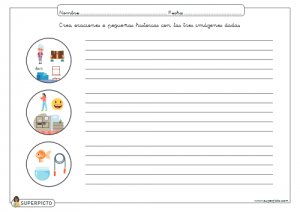 Ficha de aprendizaje sobre crear oraciones o pequeñas historias con las tres imágenes dadas realizada con una metodología divertida y didáctica con el fin de ayudar y facilitar el aprendizaje. La ficha se presenta en formato pdf descargable y listo para imprimir.