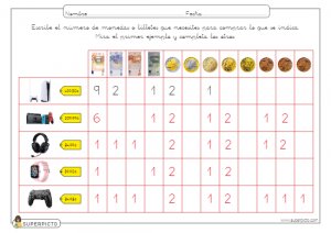 Ficha de aprendizaje sobre equivalencias para poner la cantidad que corresponda realizada con una metodología divertida y didáctica con el fin de ayudar y facilitar el aprendizaje. La ficha se presenta en formato pdf descargable y listo para imprimir.