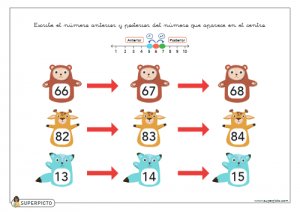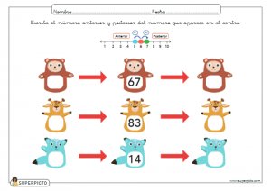 Ficha de aprendizaje sobre escribir el número anterior y posterior (con apoyo explicativo visual) realizada con una metodología divertida y didáctica con el fin de ayudar y facilitar el aprendizaje. La ficha se presenta en formato pdf descargable y listo para imprimir.
