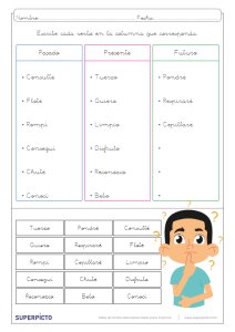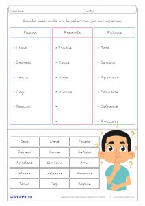 Ficha de aprendizaje sobre presente, pasado y futuro realizada con una metodología divertida y didáctica con el fin de ayudar y facilitar el aprendizaje. La ficha se presenta en formato pdf descargable y listo para imprimir.