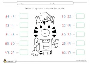 Ficha de aprendizaje sobre restas horizontales con llevadas realizada con una metodología divertida y didáctica con el fin de ayudar y facilitar el aprendizaje. La ficha se presenta en formato pdf descargable y listo para imprimir.