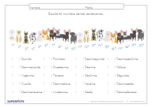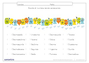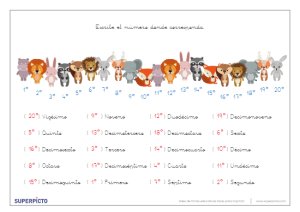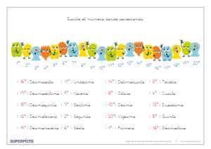 Ficha de aprendizaje sobre utilizar los veinte primeros números ordinales realizada con una metodología divertida y didáctica con el fin de ayudar y facilitar el aprendizaje. La ficha se presenta en formato pdf descargable y listo para imprimir.